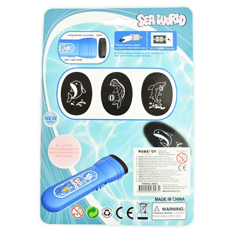 Projektorn innehåller 4 olika motiv av marina djur och växter som projiceras i imponerande 3D-effekt. Med sin kompakta storlek på 12,5cm passar den perfekt i barnhanden. En underhållande och pedagogisk leksak som kombinerar visuell stimulans med kunskap om havets ekosystem - så barnen kan leka, lära och växa tillsammans med naturens underverk.