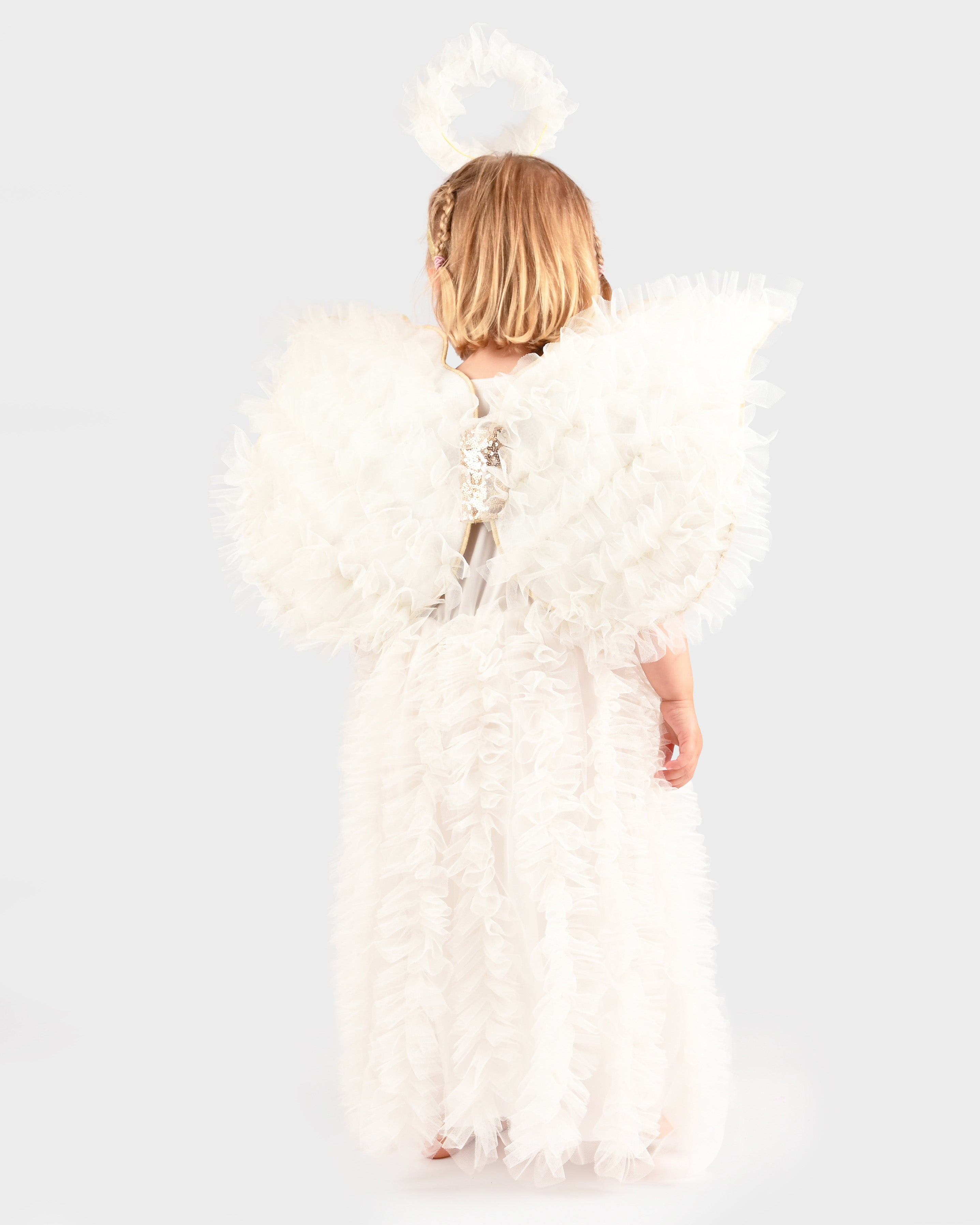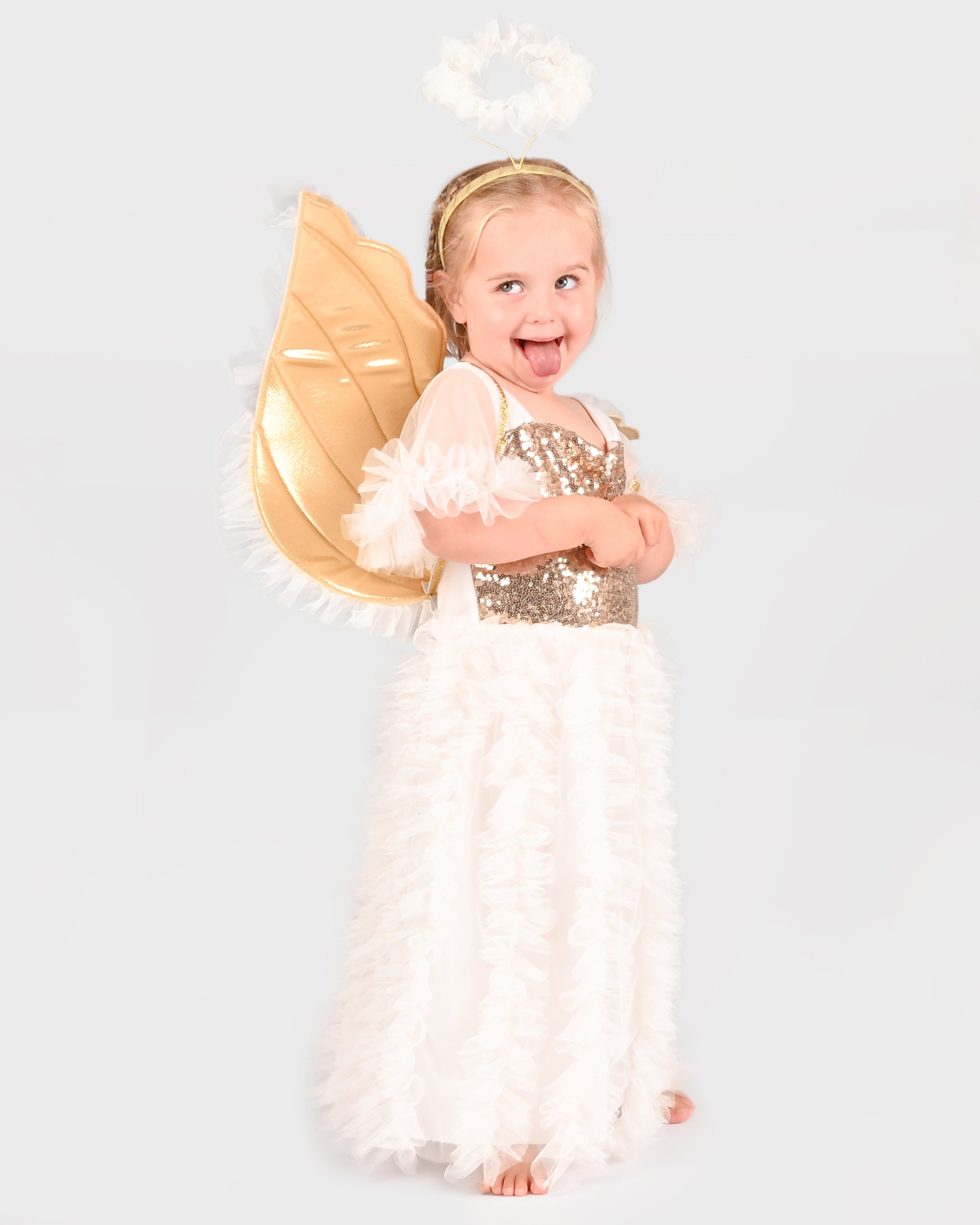 Förvandla lekstunder till magiska äventyr med detta förtrollande änglakostymset. Den vackra vita klänningen med guldglittrande paljetter och flygande tüll skapar omedelbar glädje och låter fantasin sväva fritt. Perfekt för rollspel, teaterlekar och speciella tillfällen där barnet får känna sig unikt och speciellt.