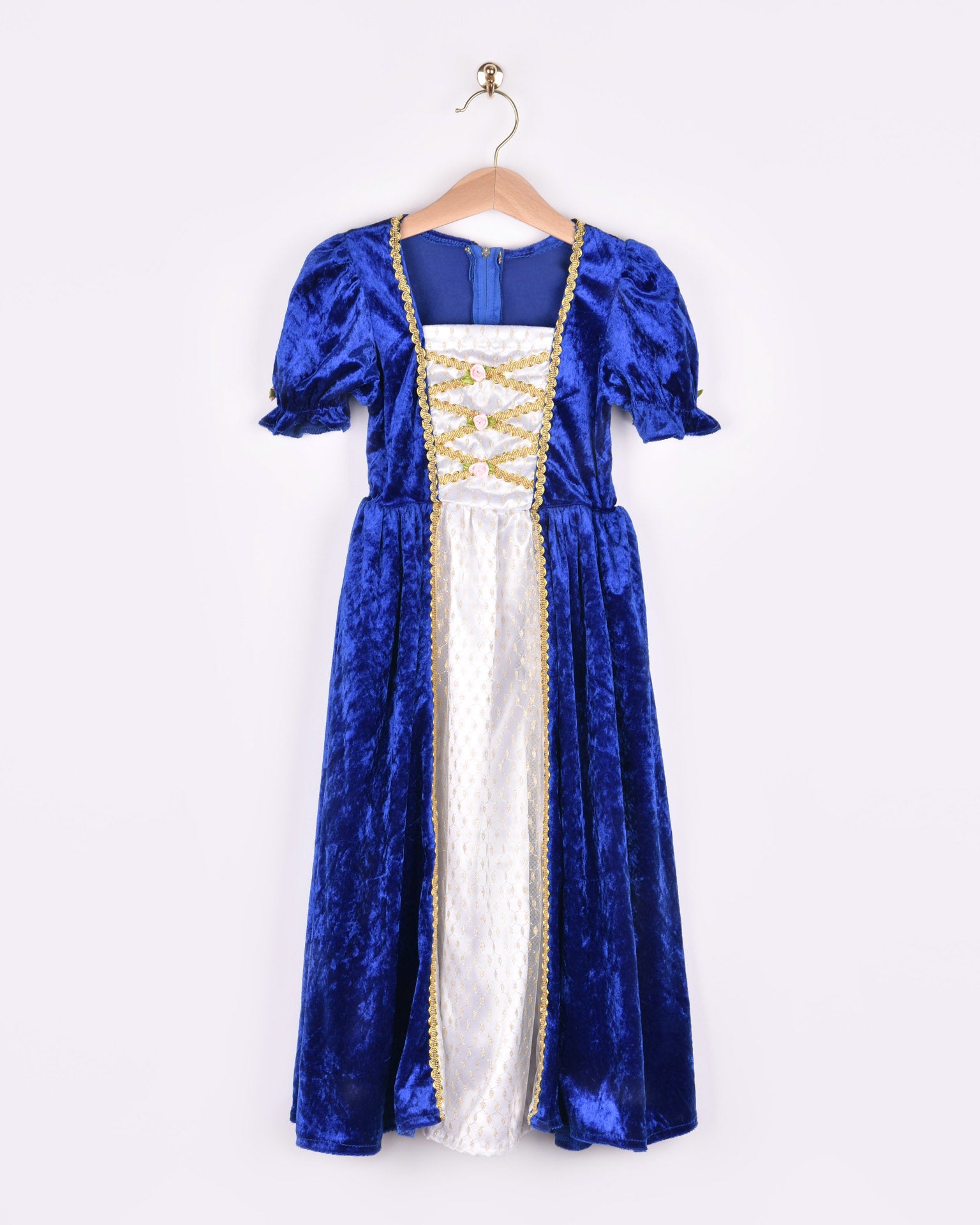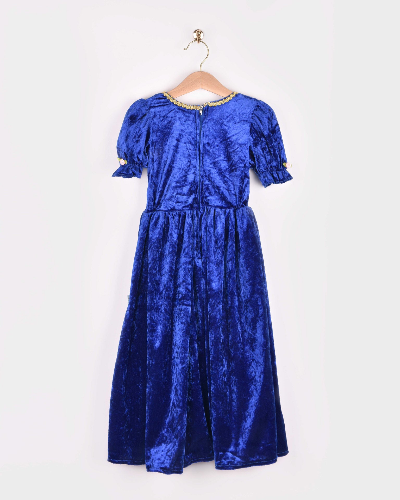 Förverkliga små prinsessans drömmar med denna praktfulla sammetsklänning som skapar oförglömliga lekmöten. Den blå satinsammeten och gyllene detaljer ger en känsla av äkta elegance medan bekväma passformen möjliggör timmar av obehindrad fantasi och rolig lekar. Perfekt för födelsedagar, teatraliska uppträdanden eller vardaglig glamour - denna klänning väcker kreativitet och självförtroende hos varje barn som får uppleva magin.